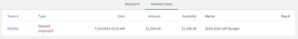 On the Account detail, the Transactions tab contains details about the completed transactions for the account (which impacts balance). The Requests tab contains details about the pending transactions / requests (which impacts encumbered funds)