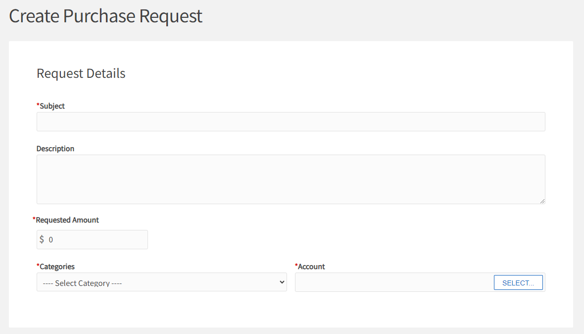 Categories - The type of purchase request based off of your submitted budget from the previous budget hearings